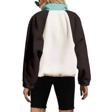 Yanekop Womens Fuzzy Fleece Pullover Sherpa Sweatshirt Long Sleeve Button Down Sweater Jacket with Pockets(Brown Light Blue,M)