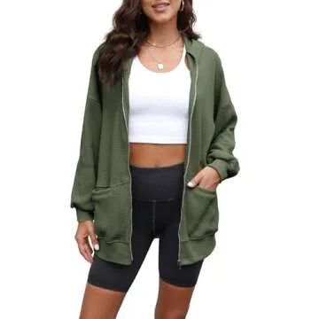 Yanekop Womens Oversized Fall Jackets Zip Up Hoodie Jacket Coat Waffle Knit Shacket Fall Outfits with Pocket(Army Green,L)