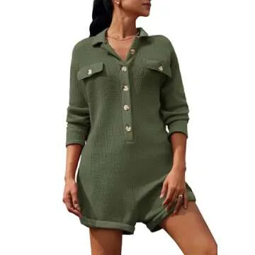 Show moreIntroducing the Yanekop Women's Waffle Knit Rompers, a beautifully crafted oversized button-down short jumpsuit designed to elevate your casual wardrobe. With its chic V-neck and sophisticated long sleeves, this romper strikes an effortless balance between comfort and style. Made from a soft, skin-friendly fabric that adapts to windy and cold days, it features functional elements such as a Henley button-up neckline, flap button pockets for added functionality, and cuffed hemlines that lend a polished finish. This versatile piece is available in an eye-catching army green color, perfect for making a fashion statement while ensuring you feel cozy and cute.