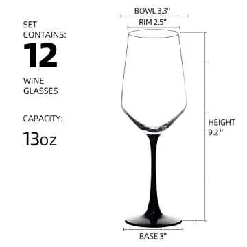 YANGNAY Wine Glasses with Black Stem & Base (Set of 12, 13 Oz), Clear Wine Glasses for Red or White Wine, Smooth Rim, Dishwasher Safe