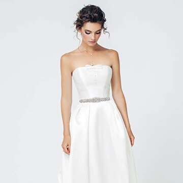 Show moreStep into your special day with the Yanstar Bridal Rhinestone Wedding Belt, an exquisite accessory designed to enhance the elegance of your bridal gown. This stunning rhinestone belt features hand-sewn craftsmanship that showcases an array of sparkling 3A+ silver rhinestones, complemented perfectly by high-quality pearls that won’t fade, rust, or corrode. Measuring 22.44 x 1.96 inches, and paired with a luxurious 100 x 0.78 inches ivory organza ribbon, this belt is crafted to accommodate various bridal figures, ensuring comfort and a perfect fit.