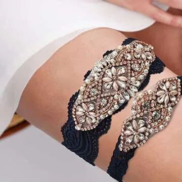 Show moreThis beautiful garter set is the perfect blend of elegance and charm, designed explicitly for brides who wish to add a touch of luxury to their wedding day. Crafted with meticulous attention to detail, the garter features stunning lace and exquisite rhinestone and pearl accents, ensuring that you feel like a queen on your special day. The rich navy blue color adds a regal touch, making it a fantastic accessory that complements a wide variety of wedding themes.