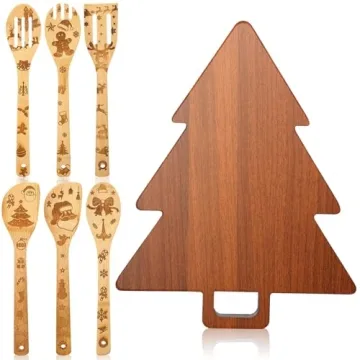 Yaomiao Christmas Kitchen Utensils Set: 6 Wooden Spoons & Tree Cutting Board