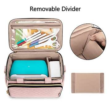 The main compartment boasts a removable divider, allowing you to neatly separate your Joy machine from the power cord, enhancing organization. Additionally, it includes a transparent zipper pocket perfect for storing your essential crafting accessories securely.