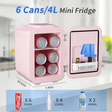 Keep your drinks and essentials perfectly chilled or warmed! The YASHE Mini Fridge is the ultimate personal refrigerator you'll ever need, combining a chic pink design with remarkable functionality. This compact 4-liter mini fridge allows you to store up to six 12oz soda cans, making it the ideal solution for anyone on-the-go. Its ingenious design is perfect for snug spaces, fitting effortlessly into your car, office desktop, bedroom, dorm room, or RV. With internal dimensions of 5.3x5.7x7.9...