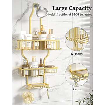 YASONIC Shower Caddy Hanging - Never Rust Shower Organizer - Aluminum over The shower head caddy with 10 Hooks for Razor/Sponge - Shower Rack with Soap Basket - Gold