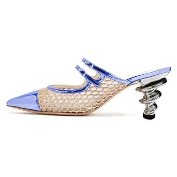 YDN Chic Spiral Thick Mid Heels Pumps Pointed Toe Slip On Mules Clogs Mesh Cutout Sandals Women Shoes Blue 4