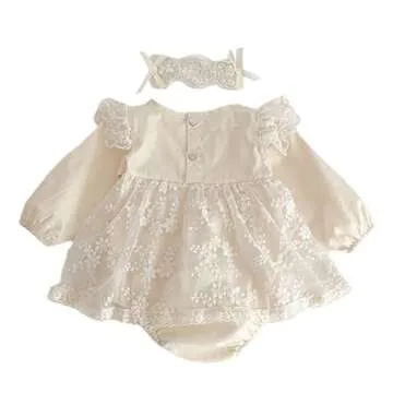 YEAHDOR Infant Baby Girls Boho Lace Romper Princess Dress Ruffle Long Sleeve Floral Bodysuit Birthday Clothes Beige 9-12 Months