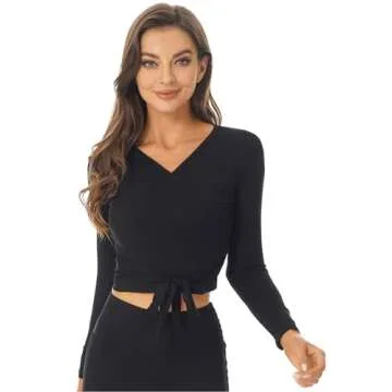 YEAHDOR Women's Self Tie Long Sleeve Ballet Dance Wrap Top V Neck Crochet Tops Gym Yoga Sport Cover Up