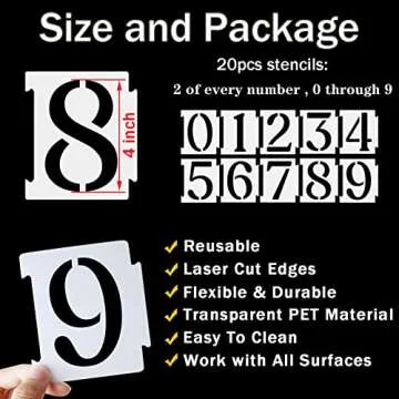 Show moreTransform your spaces with the YEAJON 4 Inch Curb Stencil Kit, a comprehensive package that equips you with 20 durable stencils, covering numbers from 0 to 9. Designed with both functionality and ease of use in mind, these stencils feature an interlocking design ensuring perfect alignment every time you want to paint your numbers on curbs, mailboxes, or walls. Made from high-quality, 14 mil Mylar plastic, this product guarantees sturdiness and reusable performance, allowing you to complete numerous projects without compromising quality.