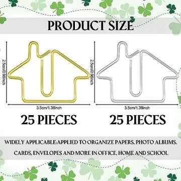 Show moreAdd a touch of charm and functionality to your paperwork with the Yeaqee House Shaped Paper Clips. This delightful set includes an impressive **50 pieces**, featuring a captivating blend of **gold** and **silver** colors—25 of each—perfectly catering to your aesthetic needs while adding a whimsical flair to your documents. These uniquely designed paper clips not only enhance your organization efforts but also create an engaging experience for your clients, especially those in the real estate sector.