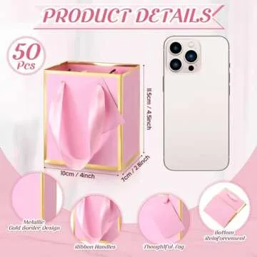 Yeaqee 50 Pcs Mini Metallic Paper Gift Bags with Handles 4x2.75x4.5'' Tiny Small Gift Bags with Thank You Tag for Wedding Favor Birthday Party Graduation Party Goodie Bridal Shower(Pink, Gold)
