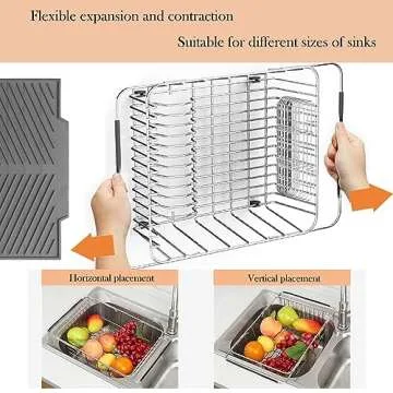 Show more This versatile Sink Drying Rack is an essential addition to any modern kitchen, expertly crafted to enhance your dishwashing experience. Made from premium 304 stainless steel, it boasts unparalleled resistance to rust, corrosion, and damage from acids and alkalis, ensuring it'll stand the test of time in your kitchen environment. Alongside, the included durable silicone drainage mat is cold and heat resistant, capable of withstanding temperatures from -104℉ to +464℉, making it perfect for various uses.