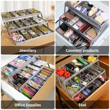 Yeeyuue 3 Tier Drawer Organizer - Expandable Junk Drawer Organizer - Small Drawer Organizer - Multi Level Folding Smart Drawer Organizer for Makeup, Jewelry, Desk, Office Drawers(1 Row 3 Tier-Grey)