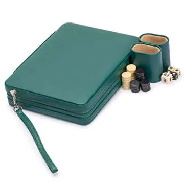 - Complete Accessory Package: Each set includes everything needed for an entertaining match: two sets of 15 magnetic checkers, four dice, one doubling cube, and two sturdy leatherette cups.