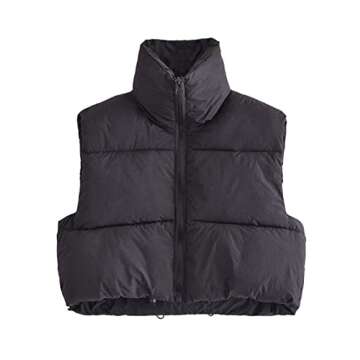 Stand up collar, full zip, sleeveless, adjustable drawstring hem to help the fit, cropped puffer vest