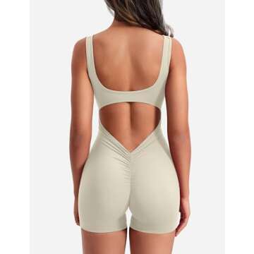 Show more Introducing the YEOREO One Piece Workout Jumpsuit for Women, an effortlessly stylish and functional addition to your fitness wardrobe. Designed with a stunning backless feature, this jumpsuit beautifully accentuates your back curves while ensuring optimal comfort during workouts or casual outings. The versatile V back scrunch design takes your style quotient up a notch, creating a captivating silhouette that enhances your natural shape. Made from moisture-absorbing and breathable fabric, this jumpsuit offers a soft touch against your skin, with exceptional elasticity for unrestricted movement.