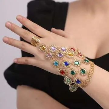 YERTTER Vintage Style Gold Plated Gemstone Bracelet Colorful Crystal Finger Ring Adjustable Cuff Belly Dancers Hand Accessories
