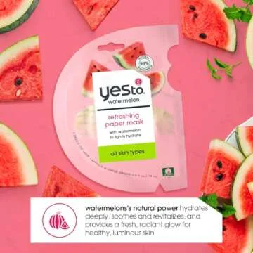Show moreExperience refreshing hydration like never before with the Yes To Super Fresh Paper Mask infused with the goodness of juicy watermelon. This dermatologist-tested product is designed for all skin types, ensuring that everyone can indulge in a soothing skin treatment that hydrates and moisturizes in just 10 minutes. The mask is crafted from 100% natural, soft cotton paper that conforms perfectly to the curves of your face, providing gentle care with every use. Filled with powerful ingredients, this mask includes Aloe, Glycerin, and Watermelon Extract, which together create a delightful experience that lightly moisturizes and invigorates your skin. Each application leaves your skin feeling refreshed, looking brighter, and smoother than ever. Made without harmful parabens and silicones, you can enjoy this treat without worry!
