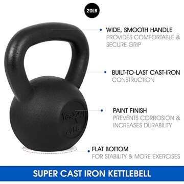 Show moreIntroducing the Yes4All Solid Cast Iron Kettlebell Weights Set, expertly crafted for fitness enthusiasts who are dedicated to achieving their strength training goals. This remarkable 20-pound kettlebell is designed with a solid cast iron construction, ensuring unmatched durability and long-lasting performance. Engineered without any welds, weak spots, or seams, this kettlebell delivers a consistent workout experience that stands the test of time. Its sleek black paint finish not only enhances its aesthetic appeal but also adds a corrosion-resistant layer, allowing you to focus fully on your exercise regimen without worrying about grip slippage.