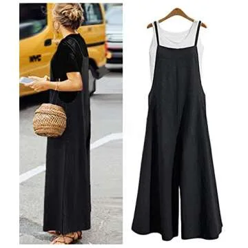 YESNO Women Casual Loose Long Bib Pants Wide Leg Jumpsuits Baggy Cotton Rompers Overalls with Pockets (S PZZTYP2 Black)