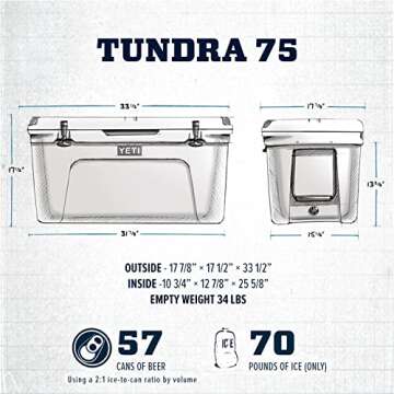 Show moreIntroducing the revolutionary YETI Tundra 75, the ultimate outdoor cooler designed to meet all your adventure needs! Whether you're planning a weekend camping trip, a day out fishing, or a beach party with friends, this cooler is your reliable companion. Built with up to 3 inches of PermaFrost Insulation, the Tundra 75 guarantees that your food and drinks will stay icy cold for days, making it perfect for all-day outings. Its FatWall design has earned it the certification of being Bear-Resistant, so you can rest assured when using it in the great outdoors.
