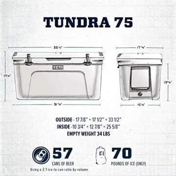 Show moreThe YETI Tundra 75 Cooler in White is the ultimate solution for outdoor enthusiasts seeking reliability and durability. With its robust Rotomolded Construction, this cooler is nearly indestructible, capable of withstanding whatever nature throws at it. Whether you’re aiming for a refreshing beverage at camp or preparing a feast during a tailgate, the Tundra 75 makes it easy to keep your food and drinks cold for days. Its impressive capacity can hold up to 50 cans while being filled with the recommended 2:1 ice-to-contents ratio. This makes it the ideal companion for larger gatherings, ensuring that all your essentials are well-stocked and chilled.