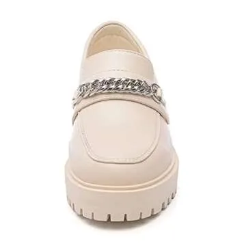 YETIER Platform Womens Loafer Leather Slip-ons Round Toe Chunky Loafer Shoes Penny Casual Fashion Shoes with Chain Beige