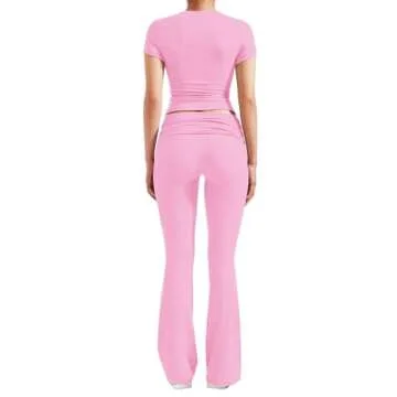 Show moreIntroducing the YETOWA Women's 2 Piece Lounge Outfits, where high fashion meets ultimate comfort! This stylish ensemble features a premium fabric blend of 92% Viscose Fiber and 8% Spandex, offering a luxuriously soft feel against your skin while ensuring exceptional elasticity. Designed with a sleek and slim silhouette, the short-sleeved tops gently contour your body, enhancing your natural curves, and pairs perfectly with fashionable low-rise flare leggings. Ideal for yoga classes, casual outings, or cozy lounging at home, this outfit guarantees you'll look chic without compromising comfort.