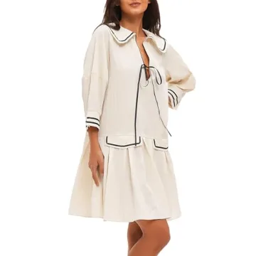YEXPINE Women's 3/4 Sleeve Collar V Neck Mini Dress Pleated A Line Swing Short Dress Summer Loose Pleated Babydoll Dress Beige