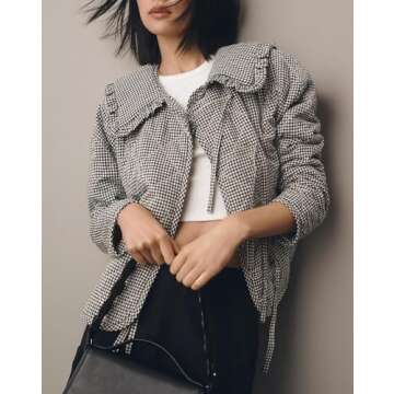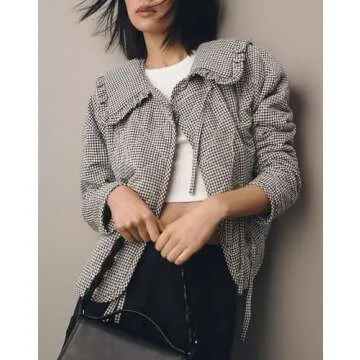 YEXPINE Women's Cropped Plaid Quilted Jacket Tie Front Lightweight Ruffled Lapel Collar Puffer Padded Coats with Pockets