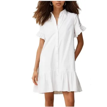 Show more Introducing a stunning addition to your wardrobe, this flowy swing shirt mini dress is crafted from high-quality cotton fabric, ensuring it is soft, skin-friendly, and breathable. Designed for ultimate comfort, this dress provides a delightful wearing experience even in the hottest summer months. With its ruffled short sleeves, drop waist design, and button-down closure, this dress exudes a blend of casual elegance and charm that makes it perfect for various occasions.