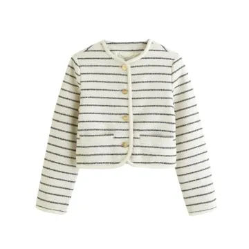 YEXPINE Women's Tweed Jackets 2024 Fall Long Sleeve Crew Neck Button Down Cropped Jacket Coat with Pockets