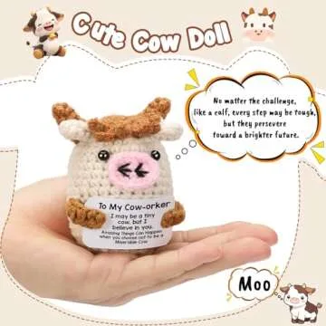 Show moreIntroducing the YEYUQIU Mini Funny Office Coworker Gifts, a delightful handmade knitted cow doll designed to bring joy and inspiration to your office or home. This charming crochet cow stands at an adorable size of approximately 3.5 x 2.36 inches, making it a perfect decorative piece that adds a touch of whimsy wherever it's placed. The playful message, "to my coworker, I may be a tiny cow, but I believe in you; amazing things can happen when you choose not to be a miserable cow," serves not just as a humorous statement but also as a heartfelt encouragement, making it more than just a cute gift—it's a token of appreciation and a reminder of positivity in the workplace. Crafted with high-quality yarn, each cow is meticulously hand-stitched, ensuring both durability and a soft, comfortable touch. It's not just decor; it's an emotional support companion!