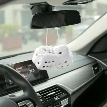 YGMONER White Fuzzy Dice for Rear View Mirror, Pair of 2.75" Plush Dice Retro Hanging Ornaments Car Interior Rearview Mirror Decor Accessories (White)