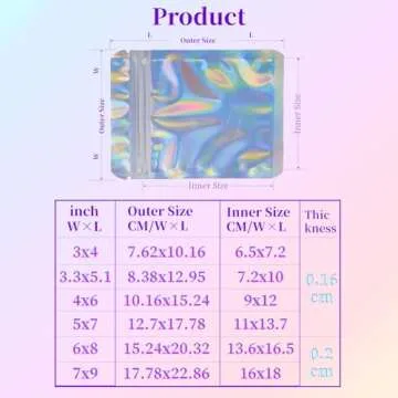 Show moreIntroducing the YHJZ 100 Pcs Holographic Bags, a vibrant and functional solution for your packaging needs. These stunning 3.3 x 5.1-inch resealable bags come adorned with a holographic rainbow design on the back, captivating attention and effectively showcasing your products. The transparent front allows for easy visibility so your customers can see exactly what’s inside. Crafted from quality aluminum foil, these bags are not only visually appealing but also practical, ensuring that your items remain clean, safe, and organized.