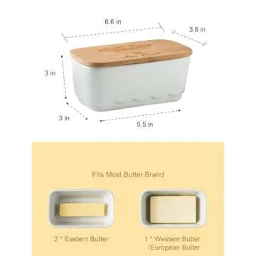 YHOJOY Covered Butter Dish for Countertop, Ceramic Butter Dish with Wooden Lid Airtight Butter Holder Container, Vintage HoneyBee Kitchen Decor, White