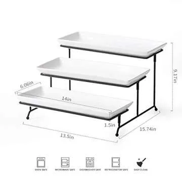 What's more, the serving stand boasts a uniquely redesigned, sturdier metal rack that locks the porcelain platters securely in place, eliminating any wobble or shaking during your gatherings. Whether it's a festive holiday party or an intimate family dinner, this 3-tier serving stand provides the balance and stability you need, ensuring that your stunning displays remain intact and impressive.