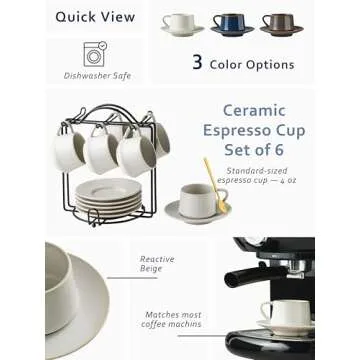 YHOSSEUN Espresso Cups with Saucers and Metal Stand, 4 Oz Ceramic Expresso Shots Cup Espresso Small Coffee Cups Set of 6, Beige