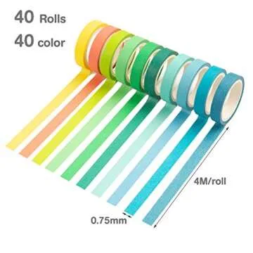 Show moreUnleash your creativity with the breathtaking YILIN Washi Tape Set, a collection of 40 vibrant rolls designed to elevate all your artistic projects. Each roll boasts a generous length of 4M (13.1ft) and a width of 0.75cm (0.29inch), offering an abundant supply to fuel your imagination and craft multiple masterpieces. Whether you’re making decorative planners, art projects, or playful decorations, the rainbow of colors in this set provides you with endless possibilities to express yourself.