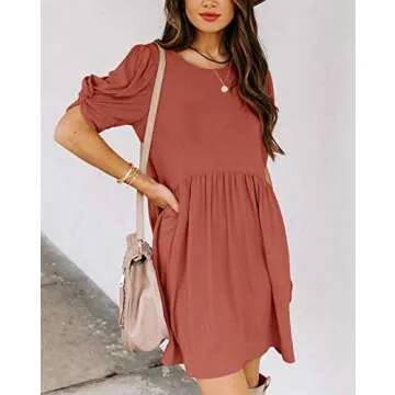 YIBOCK Women's Summer Casual Twist Knot Short Puff Sleeve Dresses Pleated Swing Dress Rust