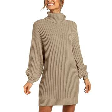 YIBOCK Women Turtleneck Long Lantern Sleeve Casual Loose Oversized Sweater Dress Soft Warm Pullover Dresses Khaki
