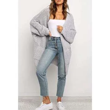 YIBOCK Womens Kimono Long Batwing Sleeve Open Front Chunky Cable Knit Cardigan Sweater with Pockets (Z Light Grey, Large)