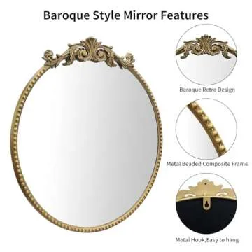 YIDIE Round Mirror, 24''Baroque Style Circle Mirror Vintage Gold Metal Frame Wall Mirrors for Vanity, Bathroom or Bedroom
