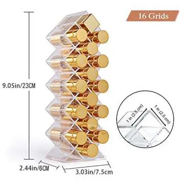 Made from **high-quality acrylic**, this lipstick organizer is built to last. Measuring 3.03 x 2.44 x 9.05 inches, each holder features **16 slots** that can accommodate various lip products including lipsticks, brushes, eyebrow pencils, and liners. Each slot is perfectly sized at 1 x 1 inches, ensuring your beauty essentials remain secure and accessible.