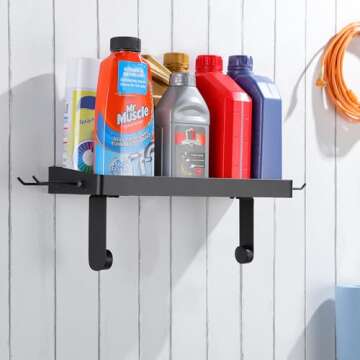 YIGII Garage Paper Towel Holder with Shelf - Wall Mount Paper Towel Holder with 4 Hooks, Single-Hand Tear Paper Towel Rack Heavy Duty Tissue Holder for Clean Station, Craft Room, Workbench (Black)