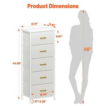 Show more Introducing the YILQQPER Dresser for Bedroom – a perfect blend of functionality and style. Measuring at 17.7'' W x 11.8'' D x 44.1'' H, this tall storage tower is elegantly designed to enhance any room in your home, whether it be your bedroom, nursery, office, or living room. The chic Glacier White finish brings a touch of sophistication while ensuring it complements your existing furniture seamlessly. Perfect for those who value aesthetics without compromising on storage capacity, this dresser is equipped with 5 spacious drawers that make organizing your items a breeze. Let this stunning piece transform your space into an organized haven.