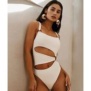 Show moreUnveiling the YIMISAN Women's One Piece Swimsuit, a stunning monokini that perfectly blends style, comfort, and functionality. Crafted from premium materials, this swimsuit features a fashionable ring cut-out design at the front, which not only accentuates your curves but also adds a touch of elegance to your beachwear collection. The high cut design elongates your legs for an attractive silhouette, making this piece perfect for sun-soaked days by the pool or on the sandy shores. Available in a classic white color, this bathing suit is versatile enough to match any beach accessory you have in mind.