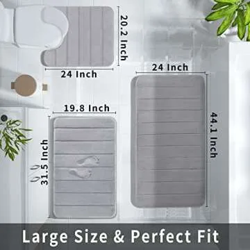 Show moreStep into luxury every time you step out of the shower with the Yimobra Bathroom Rugs Sets. This 3-piece bathroom rug set consists of a plush memory foam bath mat, a smart U-shaped toilet rug, and a large bathroom floor mat, all designed to transform your bathing experience into something extraordinary. Made from soft velvet ultra-fiber, the rugs provide a cozy feel underfoot while ensuring maximum water absorbency. Say goodbye to wet floors and hello to unmatched comfort after every bath or shower. The elegant grey color not only elevates your bathroom decor but also blends seamlessly with any existing aesthetics.