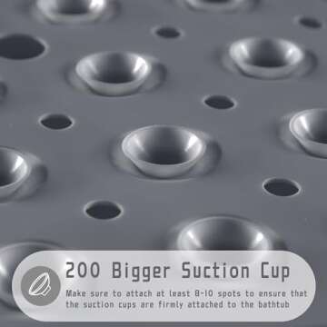 Show moreIntroducing the Yimobra Shower Mat Bathtub Mat Non-Slip, a game-changer for your bathing experience! Designed meticulously with 200 large suction cups, this premium shower mat ensures maximum grip and safety in your bathtub or shower. Measuring 40 inches by 16 inches, it covers more surface area than standard mats, significantly reducing the risk of slips and falls. Its sleek and modern design in a lovely grey complements any bathroom decor while providing a soft, bubble-textured surface that feels great underfoot. Enjoy peace of mind knowing our mat is BPA, latex, and phthalate-free, formulated for your family's safety and health.